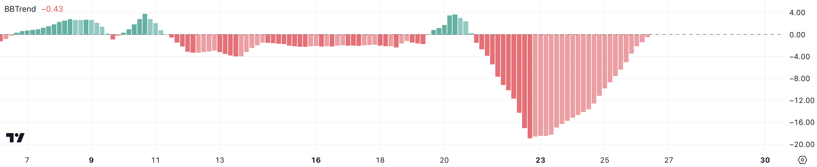 Solana BBTrend on tällä hetkellä -0,43, mikä on korkein taso sitten 21. joulukuuta. Tämä merkitsee merkittävää palautumista sen jälkeen, kun se saavutti alhaisimman tason -18,89 22. joulukuuta. Tämä tasainen nousu viittaa siihen, että laskupaine heikkenee ja ostovoima on vähitellen kasvanut viime päivinä.
