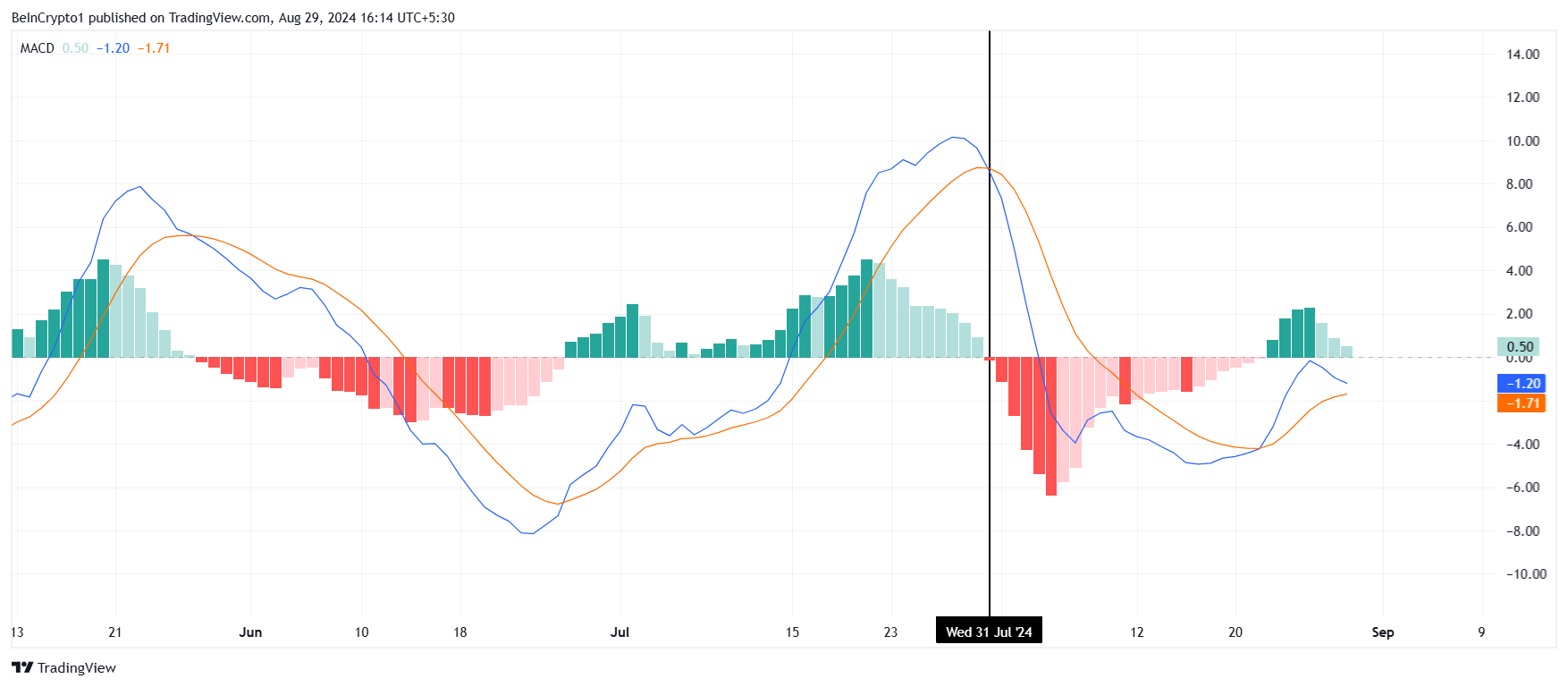 Tekniset indikaattorit vahvistavat edelleen tätä karhumaista näkemystä. Liukuvien keskiarvojen konvergenssi/divergenssi (MACD) Solanan kohdalla on lähellä karhumaista risteämistä. Tällainen risteäminen yleensä merkitsee momentumin siirtymistä härkämarkkinoilta karhumarkkinoille, mikä lisää odotusta hinnan laskusta.