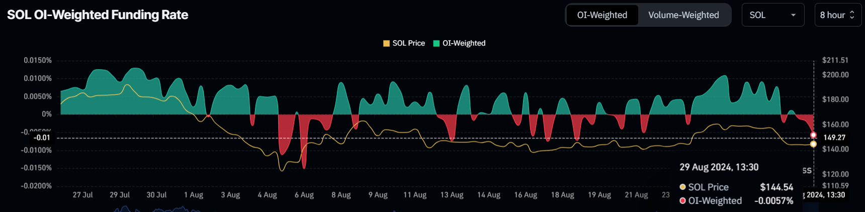 Negatiivinen rahoitusaste esiintyy yleensä, kun lyhyet positiot ylittävät pitkät, mikä tarkoittaa, että kauppiaat maksavat pitääkseen lyhyet vedot SOL:ia vastaan. Se myös osoittaa, että kauppiaat lyövät yhä enemmän vetoa SOL:n hinnan laskusta.