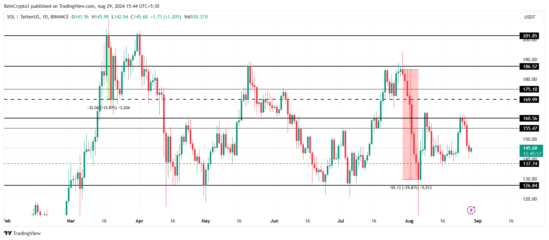 Solanan hinta, 145 dollaria, on lähellä mahdollisesti testata kriittistä tukitasoa 126 dollaria. Tämä johtuu siitä, että SOL ei onnistunut murtamaan 169 dollarin kriittistä vastustustasoa neljännen kerran viimeisten neljän kuukauden aikana.