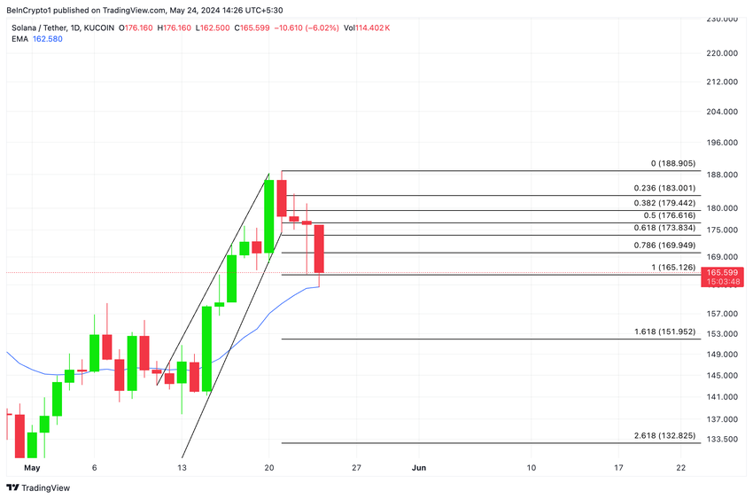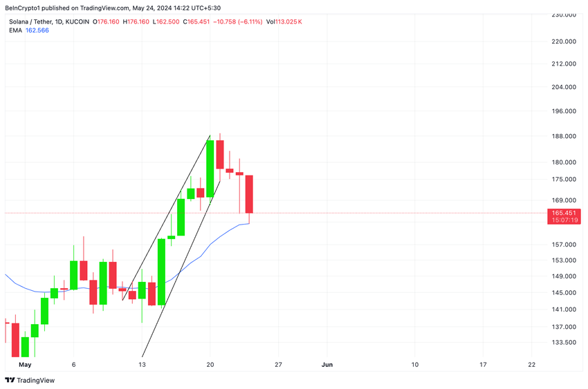 Solana (SOL) murtautui nousevasta kanavasta laskutrendissä 20. toukokuuta, ja sen arvo on sittemmin laskenut 13%.