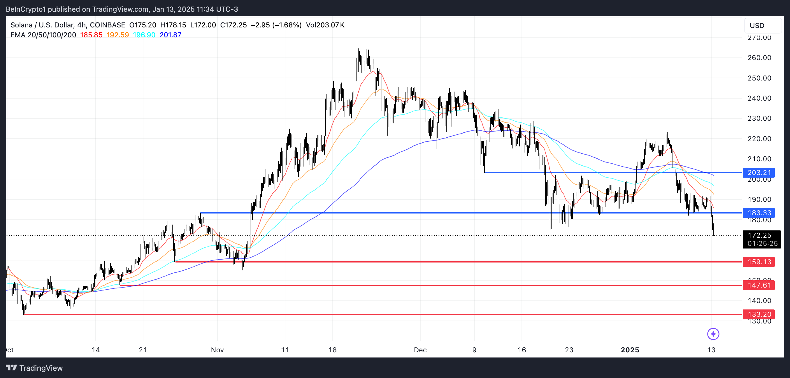 Jos nykyinen laskutrendi jatkuu, Solana-hinta voi testata seuraavaa tukitasoaan 159 dollarissa. Jos tämä taso ei pidä, hinta voi laskea edelleen 147 dollariin, ja jatkuva vahva laskutrendi voi viedä sen 133 dollariin, mikä merkitsisi 22,6 % korjausta nykyisistä tasoista.