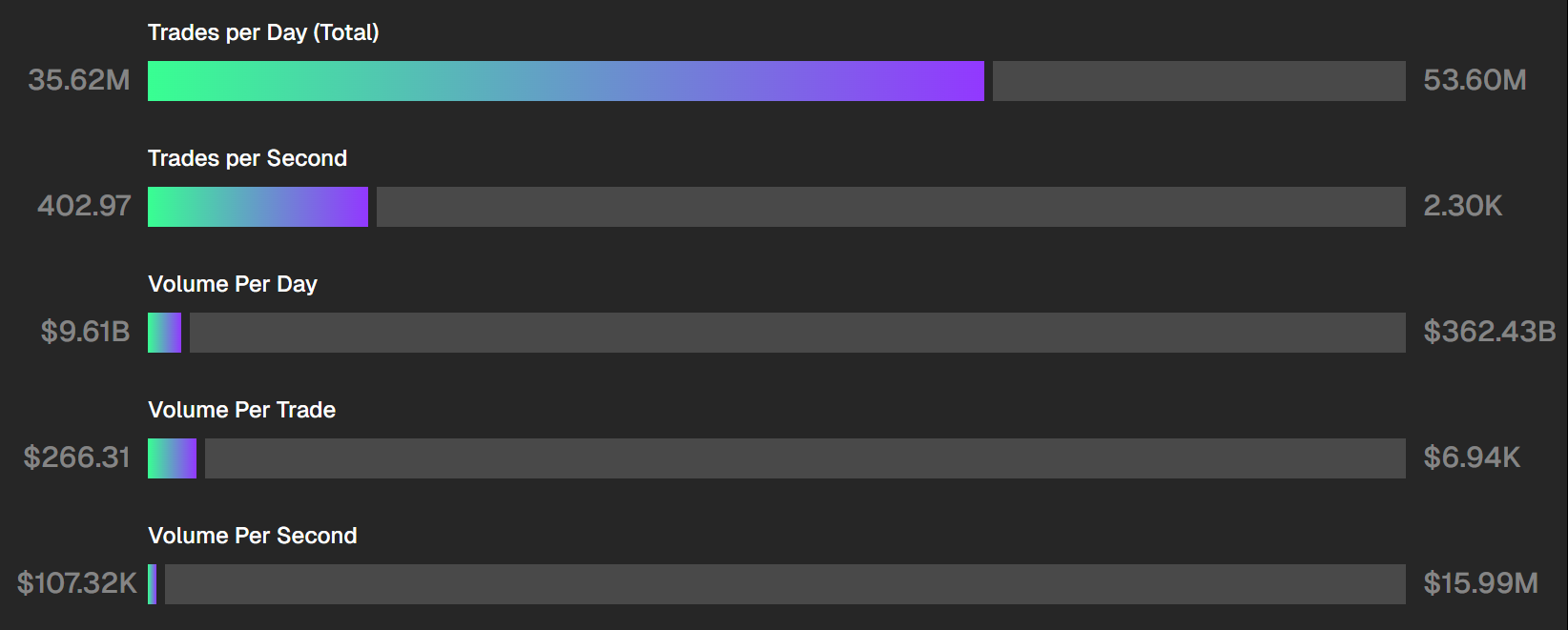 Nasdaq suorittaa noin 2 290 kauppaa sekunnissa, kun taas Solana keskimäärin 402. Päivittäisessä kaupankäyntiarvossa Nasdaq saavuttaa 362,43 miljardia dollaria, kun taas Solana 9,61 miljardia dollaria.