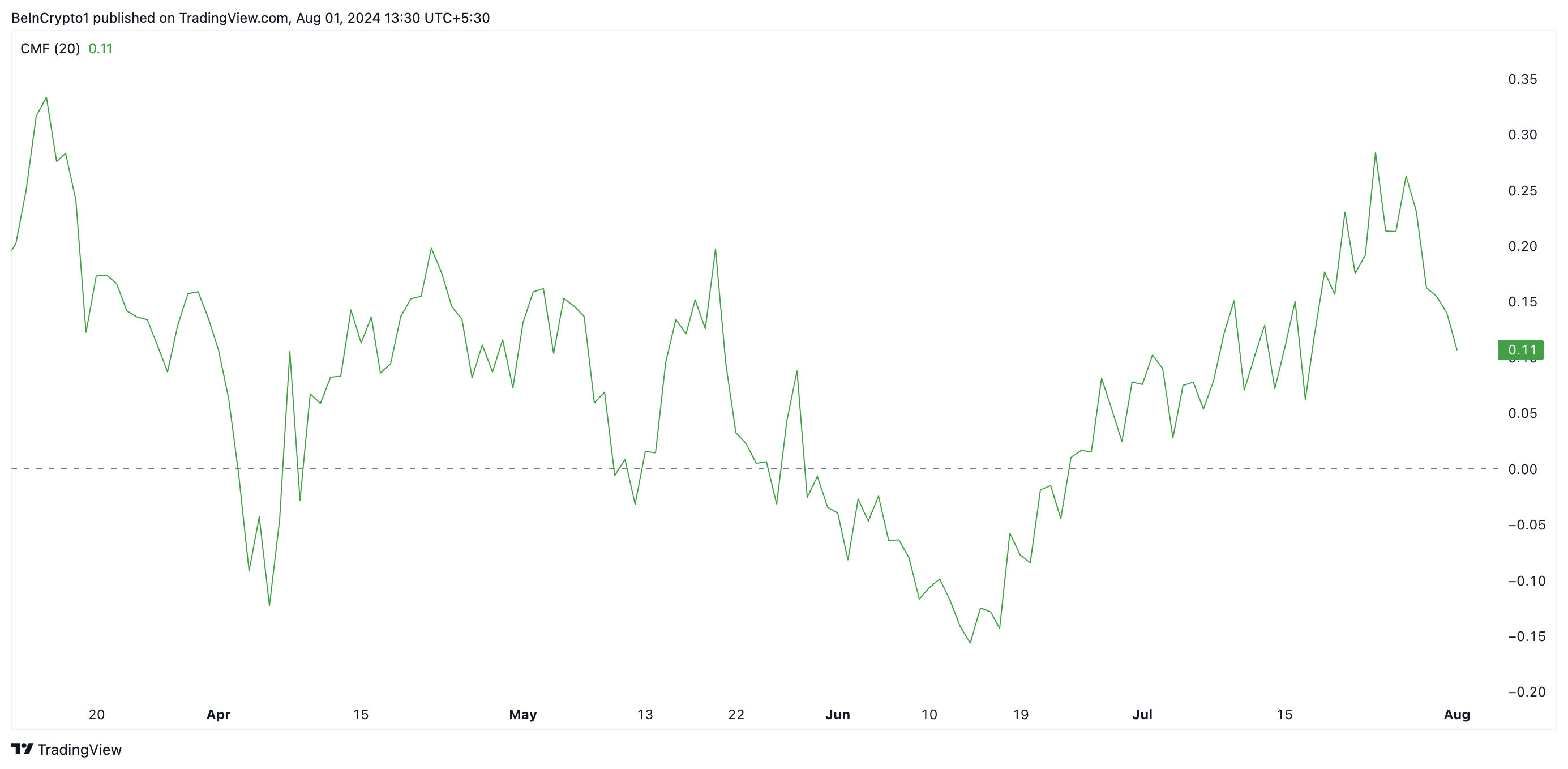 Lisäksi SOL:n Chaikin Money Flow (CMF) -indikaattorin lukemat paljastavat likviditeetin inflaation vähenemisen markkinoille. Indikaattori mittaa rahan virtausta markkinoille ja pois markkinoilta.