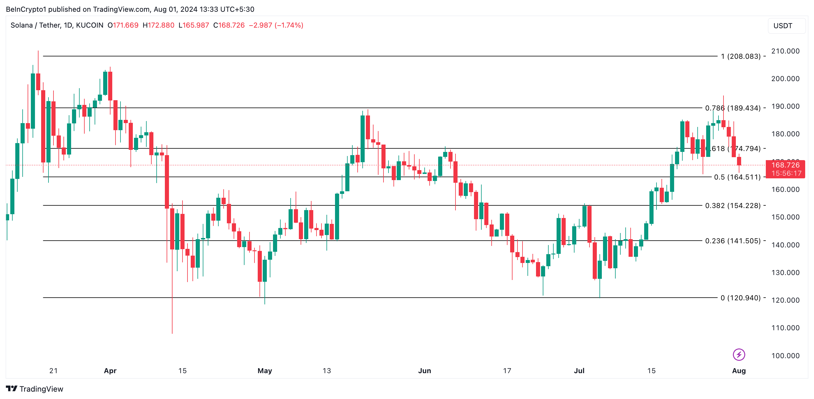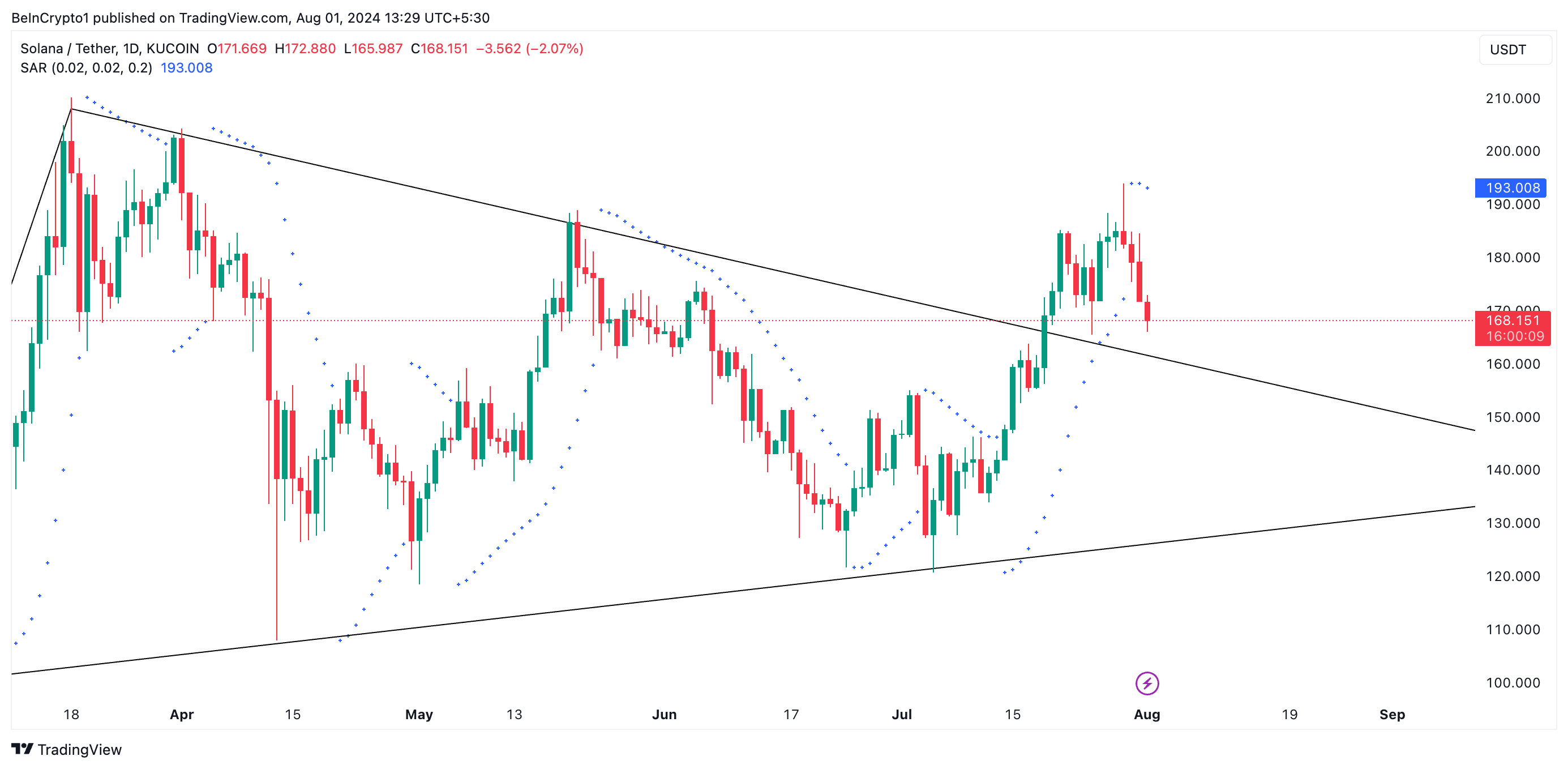 SOL mursi tämän kuvion yläpuolelle heinäkuun 19. päivänä ja jatkoi nousutrendiään. Kuitenkin heinäkuun 29. päivänä ostajien uupumus iski, ja sen hinta saavutti huippunsa 182,52 dollarissa. Kolikko käänsi suuntansa ja on siitä lähtien laskenut. Lehdistöhetkellä SOL käy kauppaa 168,93 dollarissa, laskien 7 % siitä lähtien.