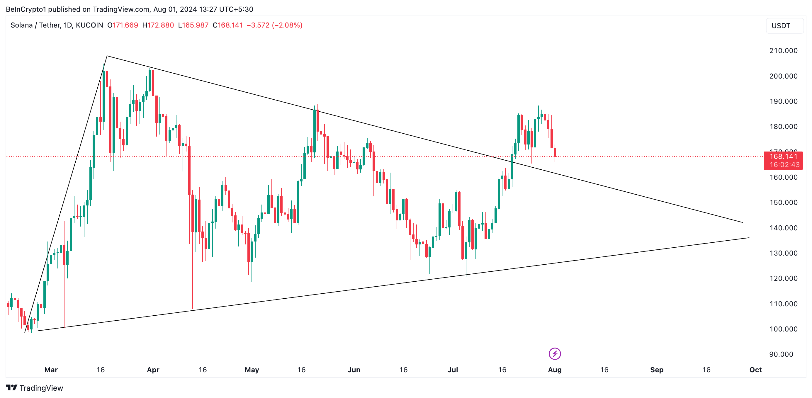 SOL aloitti kaupankäynnin symmetrisen kolmion kanavassa maaliskuun 18. päivänä. Tämä kuvio muodostuu, kun omaisuusvaran hinta käy kauppaa kahden yhtyvän linjan välissä. Se usein viittaa hintojen konsolidoitumisjaksoon markkinoilla, kun ostajat ja myyjät kamppailevat hallinnasta.