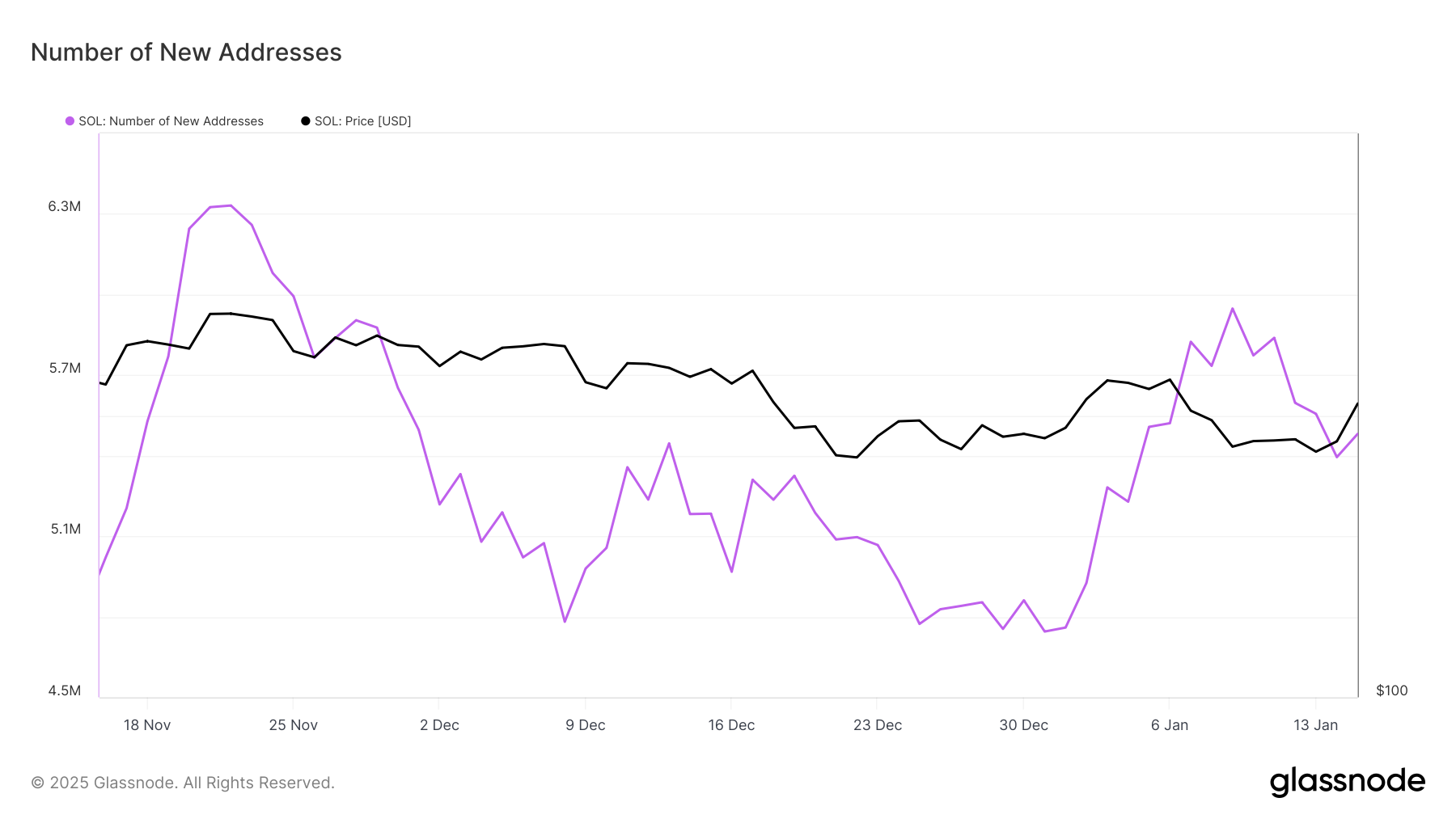 Verkko menetti 500 000 uutta sijoittajaa viimeisen kymmenen päivän aikana, kun Solanan hinta korjautui. Uudet sijoittajat tunnistetaan ainutlaatuisista osoitteista, jotka suorittavat transaktioita verkossa ensimmäistä kertaa. Tunnusluku on ratkaiseva kryptovaluutan vetovoiman arvioimiseksi ja voi parantua, kun Solanan hinta vakiintuu.