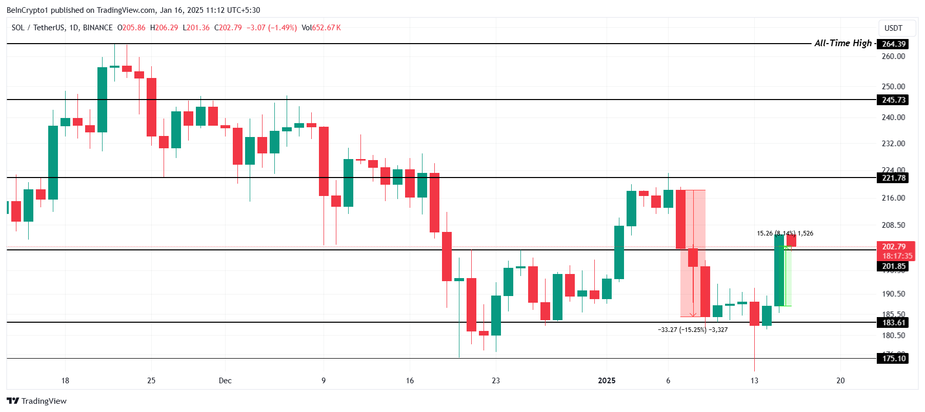 Solana käy kauppaa 202 dollarilla, pysyen kriittisen 201 dollarin tukitason yläpuolella 8 % nousun jälkeen viimeisen 24 tunnin aikana. Tämä elpyminen merkitsee merkittävää virstanpylvästä sen pyrkimyksessä palauttaa nousuvauhti.