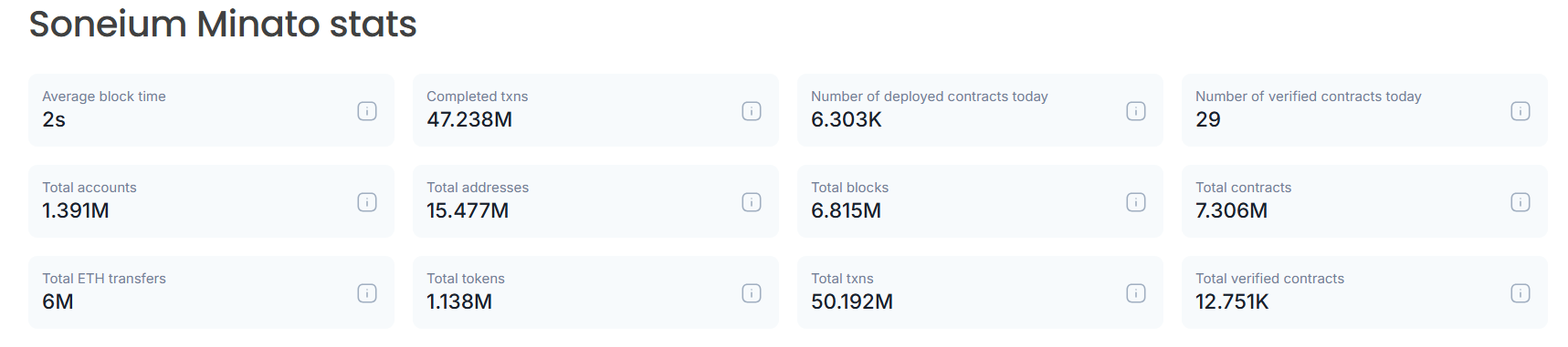 Blockscoutin tietojen mukaan Soneium-lohkoketjussa on nyt 6,8 miljoonaa lohkoa ja keskimääräinen lohkoaika on 2 sekuntia. Alustan sopimusten kokonaismäärä on 7,3 miljoonaa.
