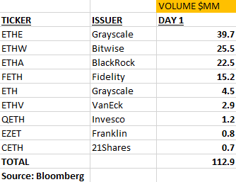 Bloomberg ETF:n analyytikoiden Eric Balchunasin ja James Seyffartin mukaan spot-ETH-pohjaiset pörssinoteeratut rahastot saavuttivat 112 miljoonan dollarin kaupankäyntivolyymin ensimmäisen 15 minuutin aikana.