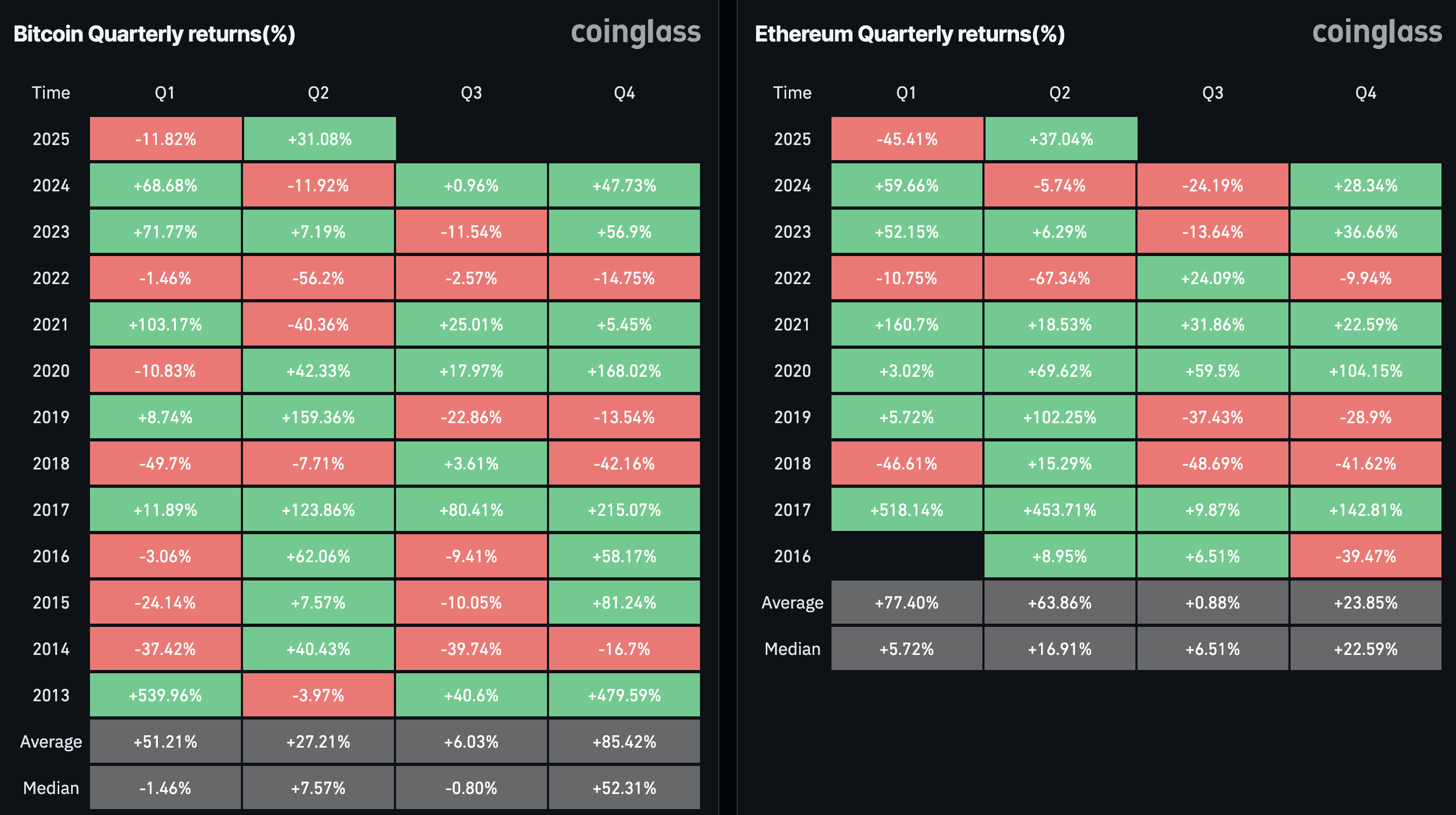 Coinglassin mukaan Bitcoinin 31,08 % palautuminen toisella neljänneksellä 2025, yhdessä Ethereumin nousun (37,04 %) kanssa, heijastaa kryptoekosysteemin vahvuutta.
