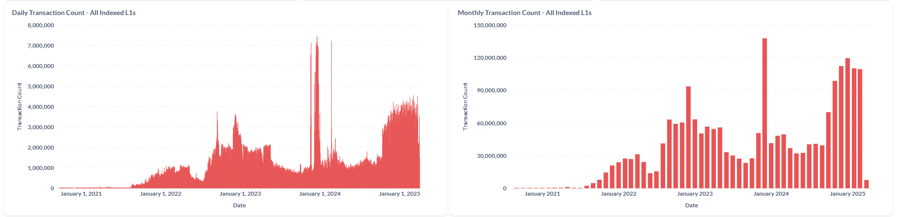 AVAX-verkon tiedot osoittavat, että vuoteen 2025 mennessä Avalanche odotetaan käsittelevän yli 4 miljoonaa päivittäistä transaktiota ja ylläpitävän kuukausittaista transaktiomäärää yli 100 miljoonan, mikä on kolme kertaa vuoden 2024 keskiarvo.