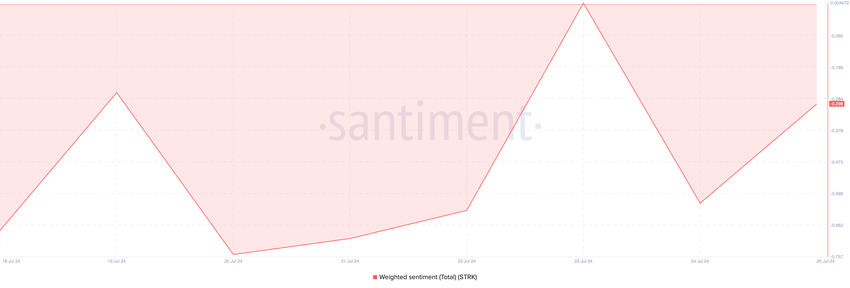 Tämä taso on lähellä ylimyynnin kynnysarvoa 30, mikä viittaa siihen, että omaisuusvara saattaa olla aliarvostettu ja sen hinta saattaa nousta, jos ostokiinnostus kasvaa. Kuitenkin negatiivinen tunnelma, joka tällä hetkellä vaikuttaa STRK:hon, saattaa olla mahdotonta lähiaikoina. Lehdistöhetkellä STRK:n painotettu tunnelma on -0,29.