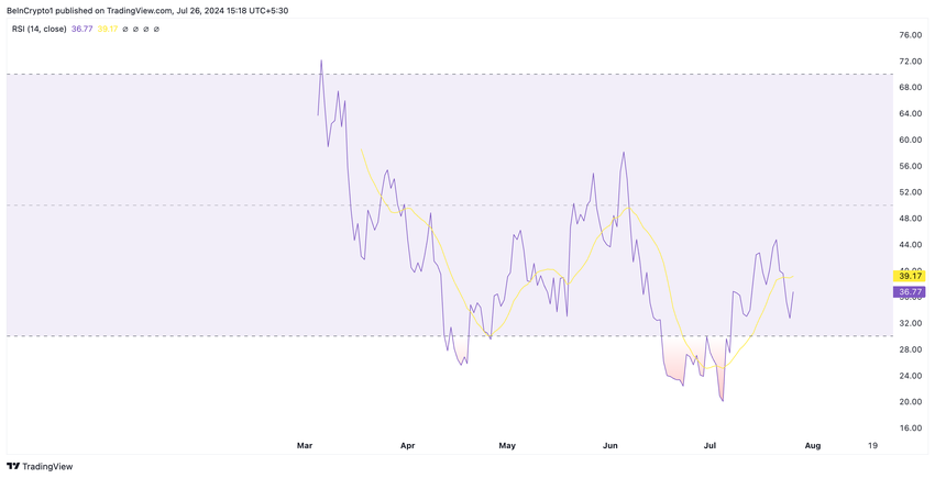 Tämä johtuu altcoinin myyntipaineen tasaisesta kasvusta. Tätä kirjoitettaessa STRK:n suhteellinen vahvuusindeksi (RSI) on laskusuunnassa ja kaukana sen 50-neutraaliviivasta 36,77:ssä.