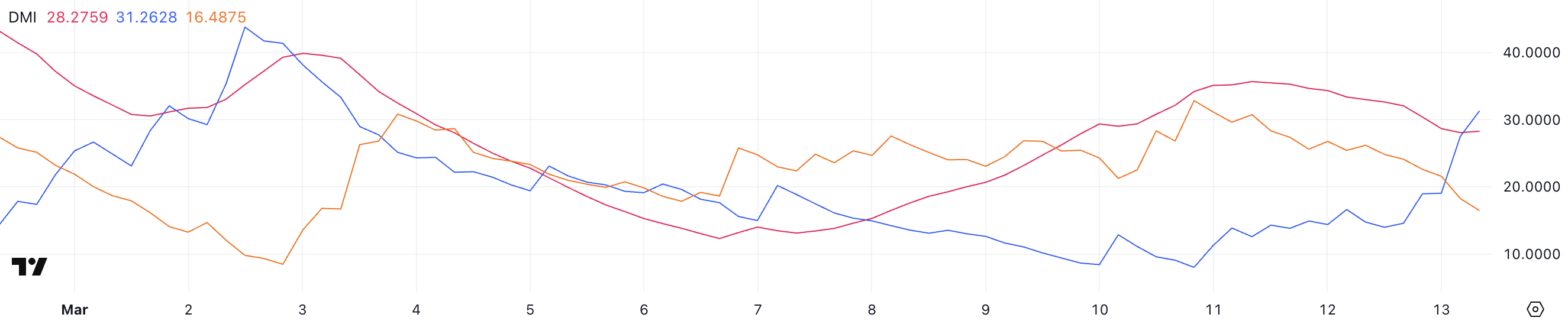 Kun tarkastellaan suuntaindikaattoreita, +DI on noussut 31,2:een 8:sta, kun taas -DI on pudonnut 16,4:ään 30,7:stä. Tämä merkittävä muutos osto- ja myyntipaineessa viittaa siihen, että härät ovat saaneet hallinnan takaisin voimakkaan myynnin jälkeen.