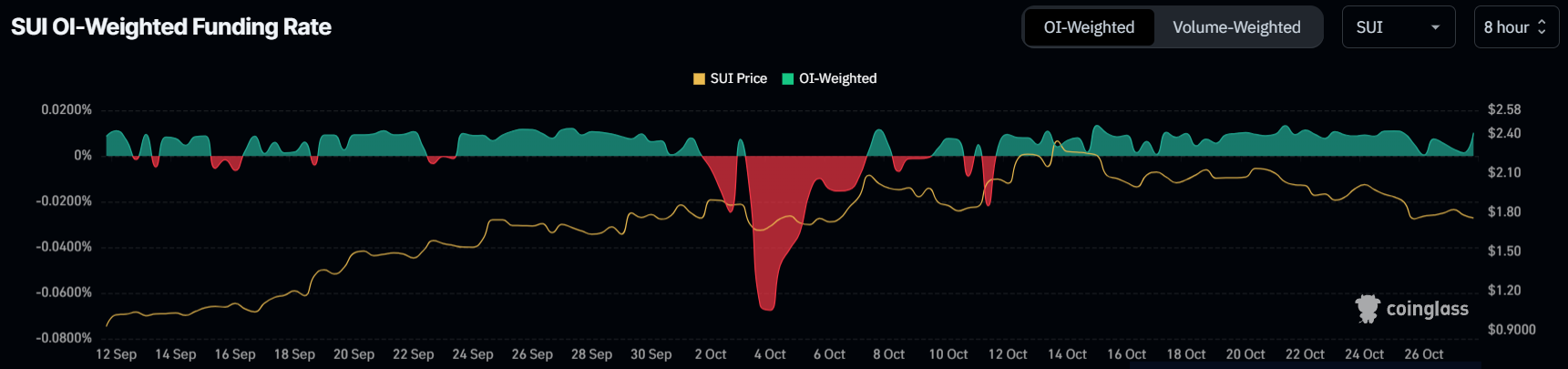 Huolimatta hinnan laskusta, SUI:n rahoitusaste pysyy positiivisena, mikä osoittaa, että kauppiaat ovat edelleen toiveikkaita toipumisesta. Positiivinen rahoitusaste hintalaskun aikana usein viittaa taustalla olevaan optimismiin, mikä vihjaa, että monet kauppiaat odottavat mahdollista palautusta. Optimismi saattaa viestiä luottamusta omistajien keskuudessa, jotka uskovat SUI:n pitkän aikavälin arvon säilyvän huolimatta äskettäisestä volatiliteetista.