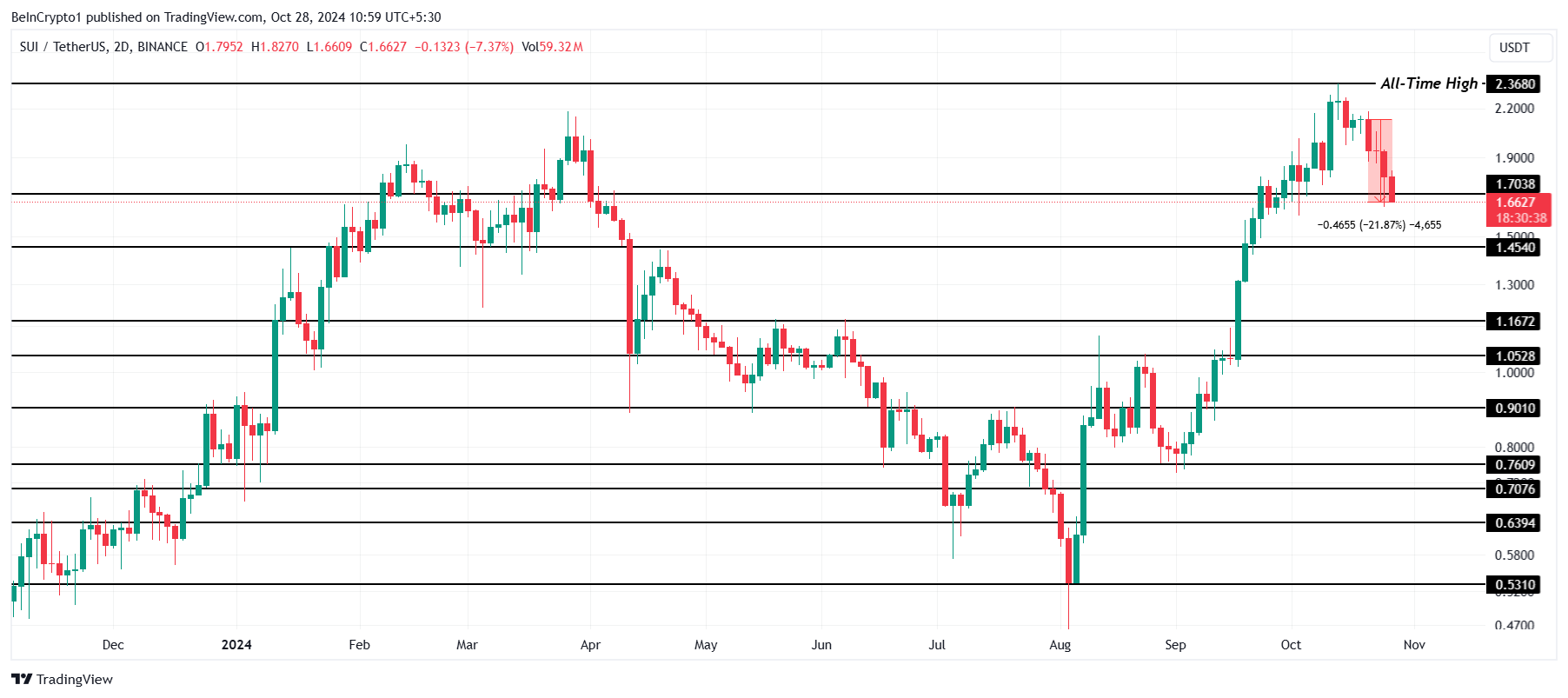SUI:n hinta on laskenut 21 % viime viikon aikana saavutettuaan ATH:n, joka oli 2,36 dollaria. Nykyisten karhumaisten merkkien perusteella hinta saattaa laskea edelleen 1,45 dollariin, mikä on aiemmin toiminut tukitasona. Tämä olisi kriittinen kohta altcoinille, testaten sijoittajien tunnelmaa.