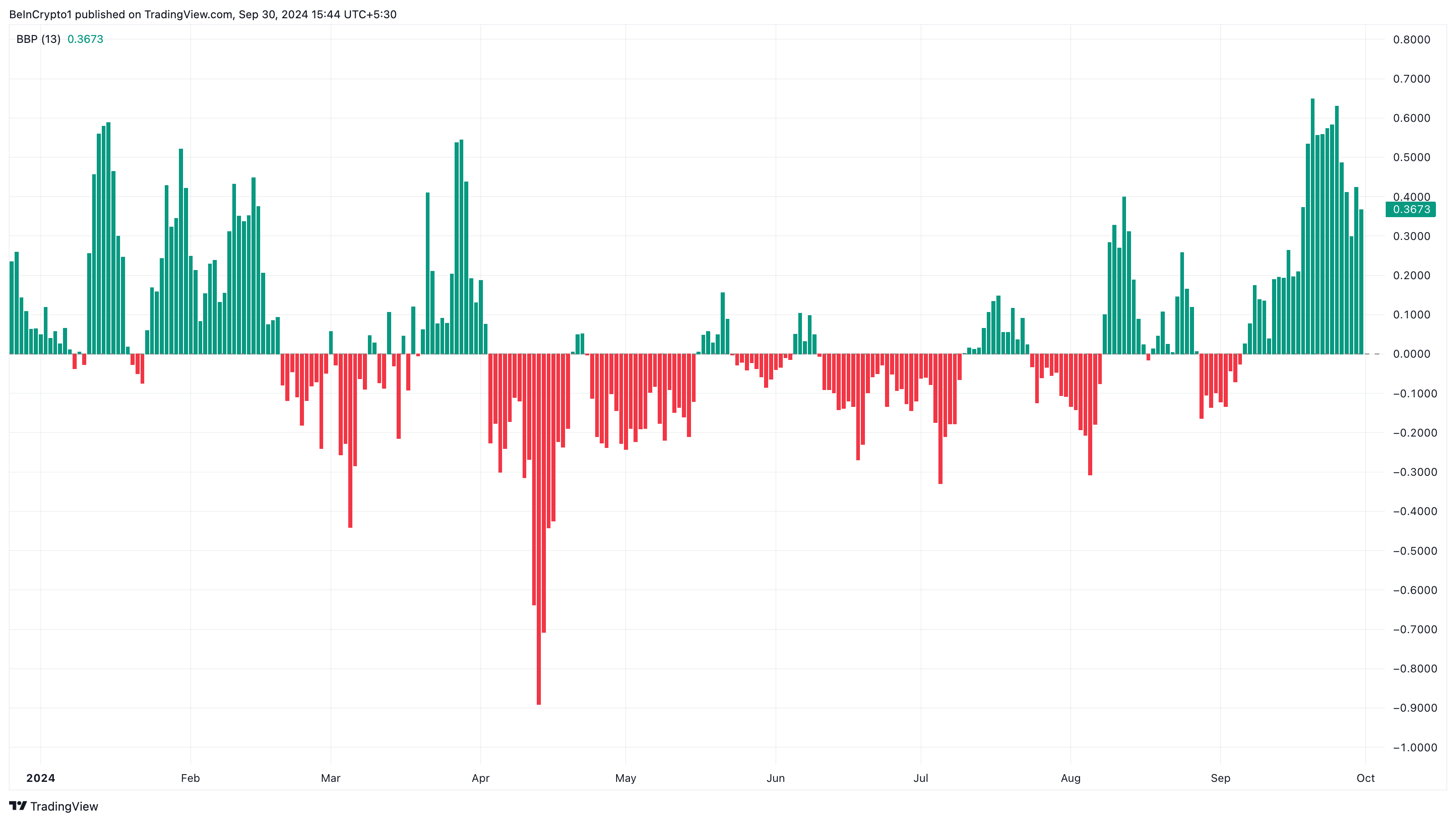 Useimmiten tämä tarjontashokki aiheuttaa suurta volatiliteettia. Kuitenkin päivittäisessä kaaviossa Bull Bear Power (BBP), joka mittaa ostajien ja myyjien voimaa, paljastaa, että härät hallitsevat.