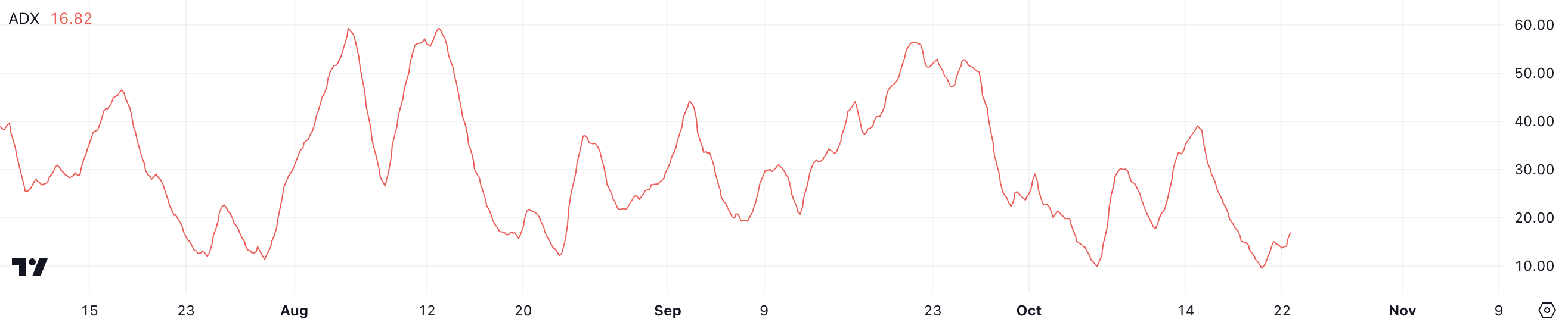 SUI:n ADX on tällä hetkellä 16,82, mikä osoittaa nykyisen trendin voimakkuuden. Arvon ollessa alle 20, tämä viittaa siihen, että trendi on edelleen heikko, mikä tarkoittaa rajoitettua suuntausta markkinoilla.