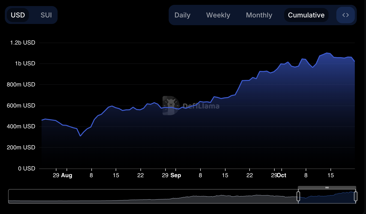 SUI:n kokonaisarvo (TVL) koki vaikuttavan kasvun, nousten 308 miljoonasta dollarista elokuun 4. päivä 1,096 miljardiin dollariin lokakuun 14. päivään mennessä. Tämä huomattava 255 %:n kasvu noin kahden kuukauden aikana on erityisen merkittävä SUI:n kaltaiselle protokollalle.