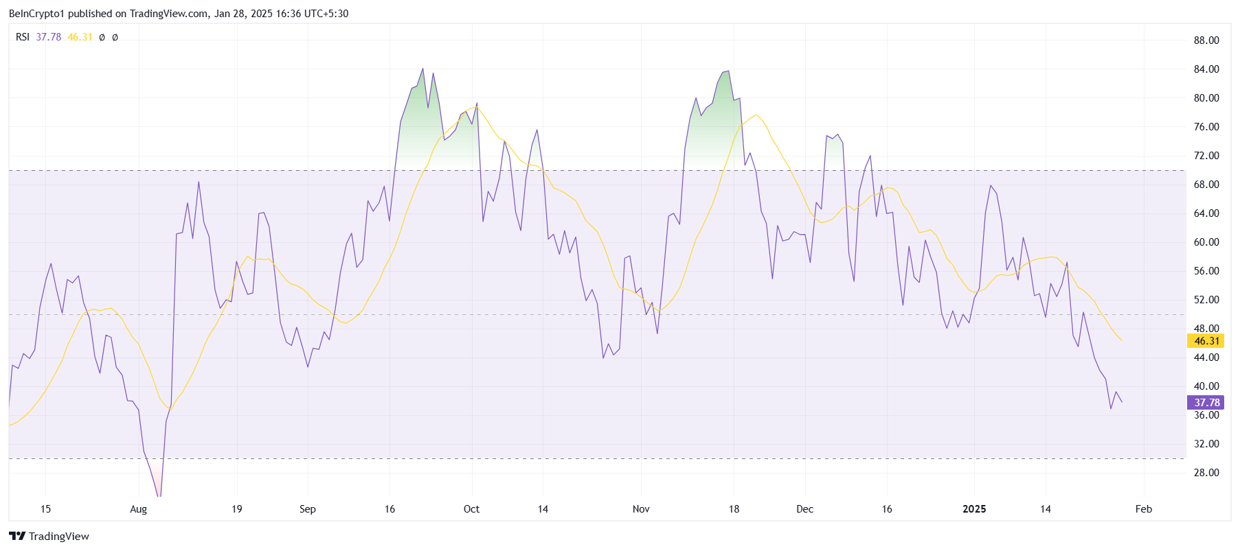 Relative Strength Index (RSI) osoittaa, että laskeva suhdanne hallitsee SUI:n hintakehitystä. RSI on pudonnut neutraalin rajan alapuolelle ja on alimmillaan sitten elokuun 2024, mikä viittaa siihen, että laajemmat markkinaolosuhteet eivät suosi palautumista lähitulevaisuudessa.