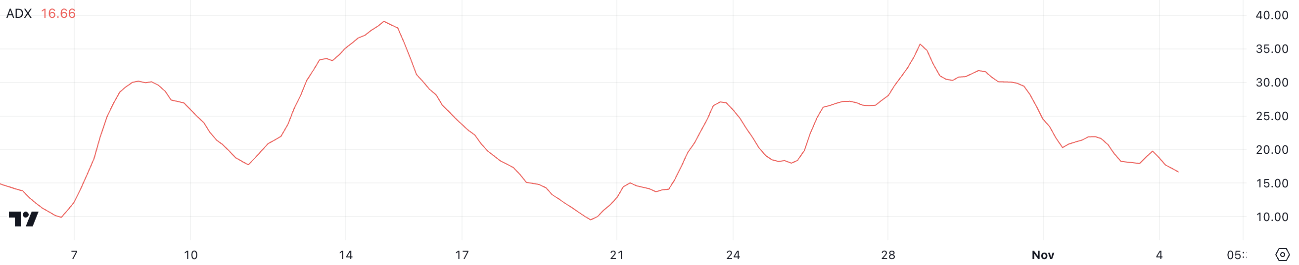 ADX auttaa mittaamaan trendin voimakkuutta sen suunnan sijaan, joten tämä matala lukema viittaa siihen, että markkinat eivät ole täysin sitoutuneet jatkuvaan karhumarkkinaan.