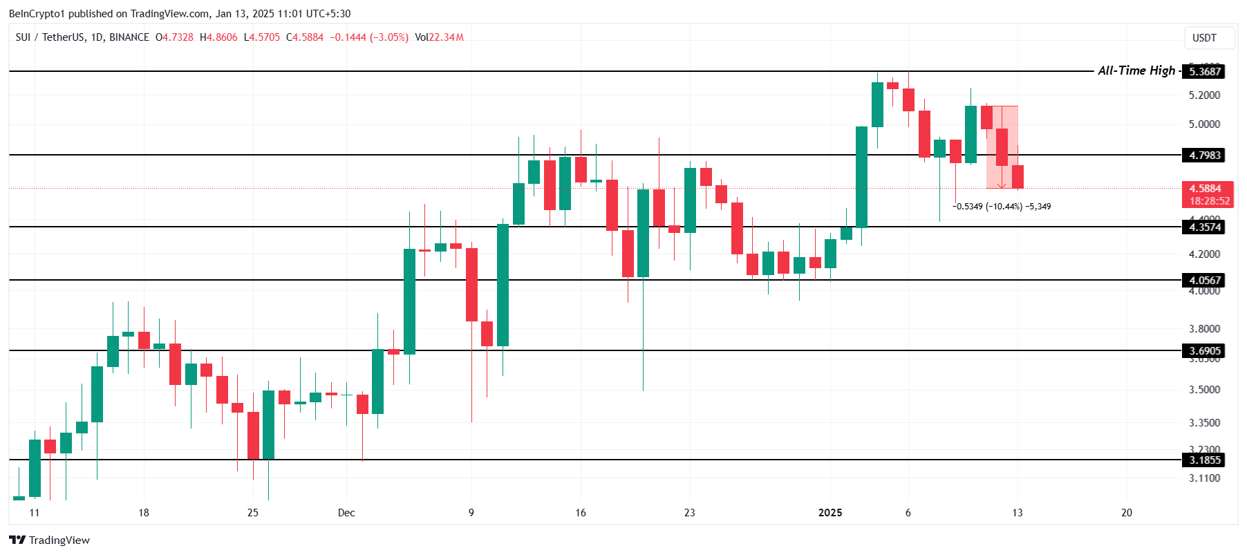 SUI saavutti äskettäin uuden kaikkien aikojen korkeimman (ATH) arvon 5,36 dollaria ennen kuin 10 %:n korjaus viimeisten kahden päivän aikana laski sen hinnan 4,58 dollariin.