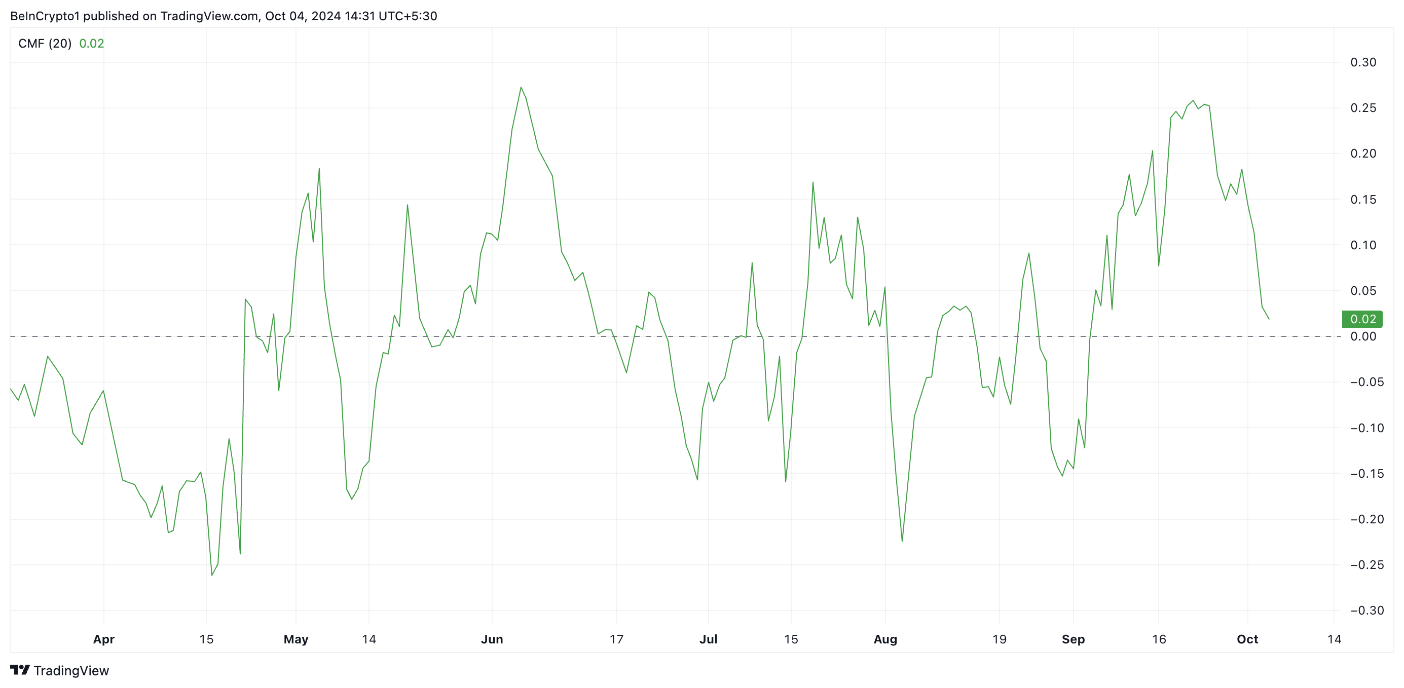Lisäksi SUI:n Chaikin Money Flow (CMF) -indikaattorin jyrkkä lasku vahvistaa ostovoiman heikkenemistä. Tätä kirjoitettaessa se on 0,02, suuntautuen kohti nollalinjaa.
