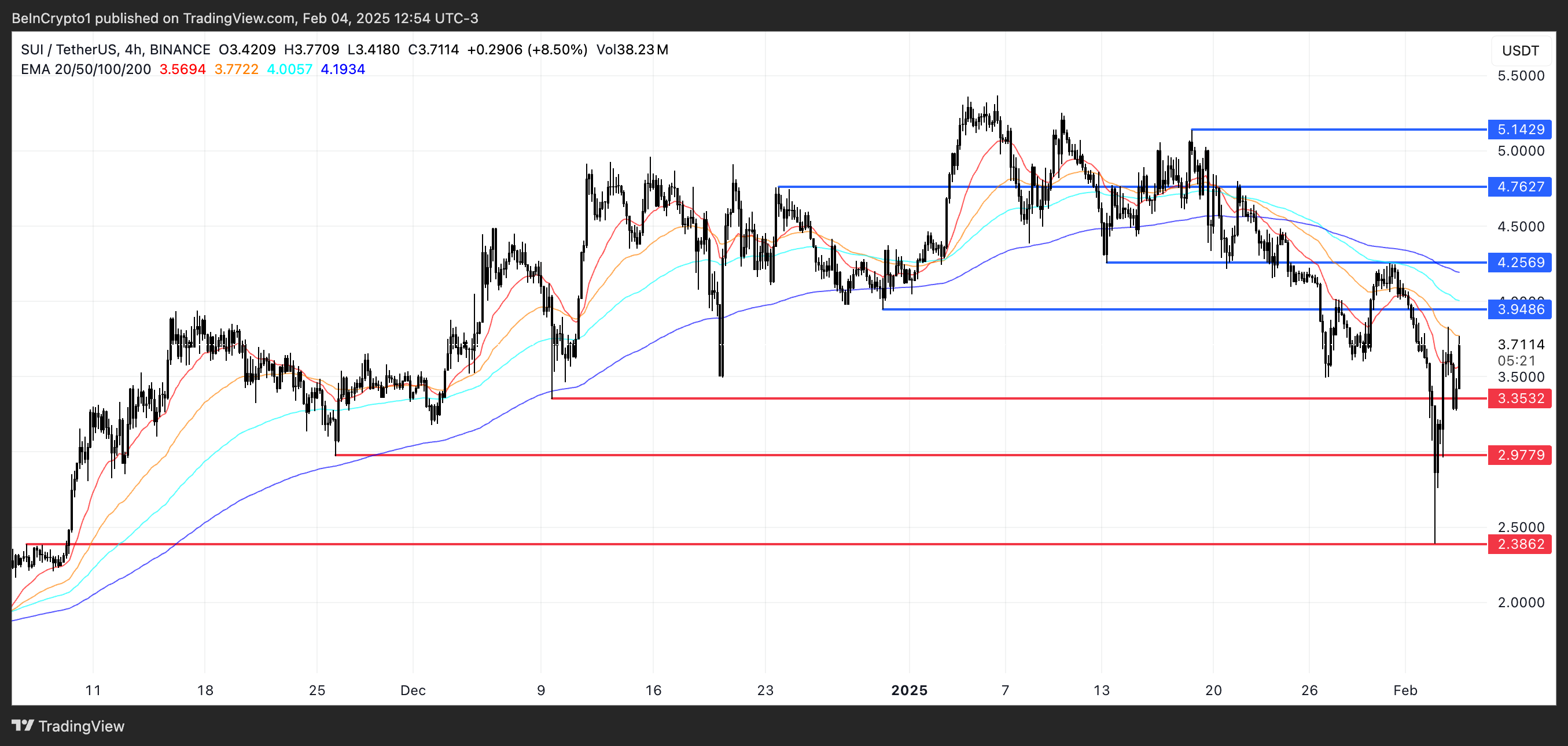 Jos nykyinen noususuuntainen tunnelma jatkuu, SUI-hinta voisi testata 3,94 dollaria, ja sen tason ylittäminen voisi johtaa liikkeeseen kohti 4,25 dollaria. Vahvempi trendin muutos voisi nostaa hinnan vielä korkeammalle, mahdollisesti saavuttaen 4,76 tai 5,14 dollaria tulevina viikkoina.