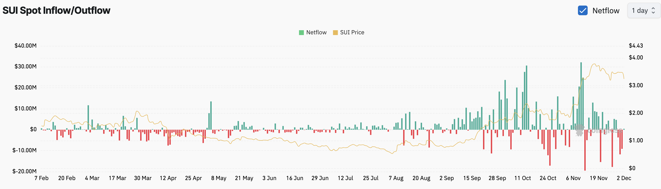 Coinglassin mukaan Sui Spot Inflow/Outflow on ollut 30. marraskuuta lähtien yhteensä noin 25 miljoonaa dollaria. Tämä sisään-/ulosvirtaus mittaa vaihtoihin lähetettyjen tai sieltä poistettujen tokenien arvoa.