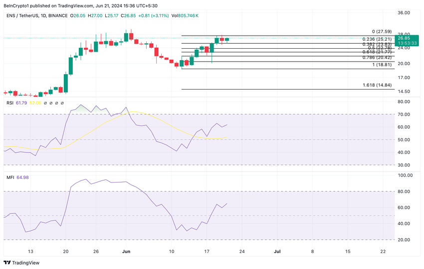 ENS:n, alkuperäisen tokenin, joka käyttää Ethereum Name Serviceä, Ethereum-pohjaista hajautettua verkkotunnusjärjestelmää, hinta on noussut 20 % viimeisen seitsemän päivän aikana. Sen arvo on tällä hetkellä 25,31 dollaria.