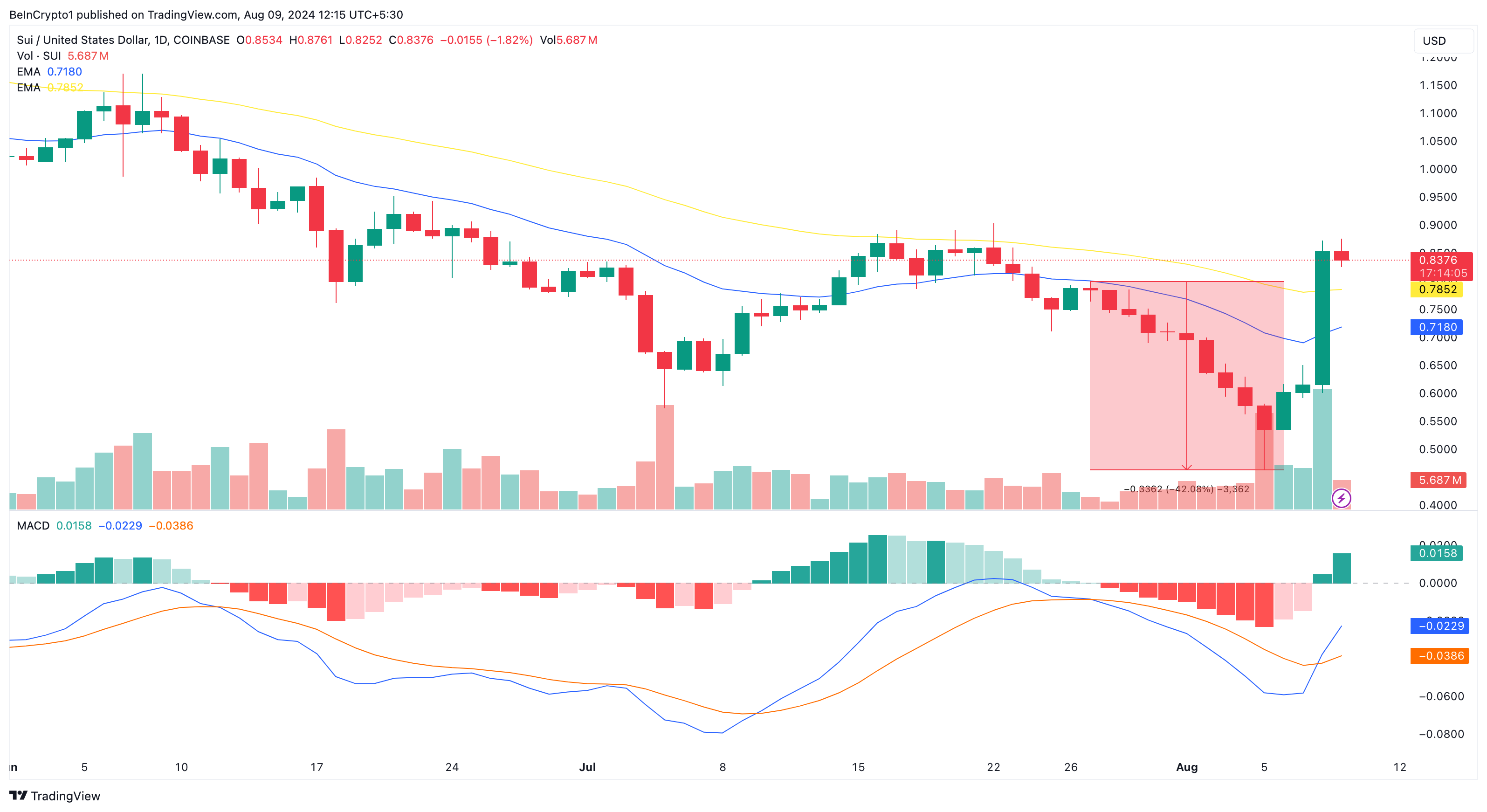 Teknisestä näkökulmasta SUI koki merkittävän 42 %:n hintapudotuksen ennen viimeisintä toipumista. Esimerkiksi 5. elokuuta hinta oli vain 0,46 dollaria. Kuitenkin nousu yli 20 (sininen) ja 50 (keltainen) EMAn auttoi vahvistamaan härkätrendin.