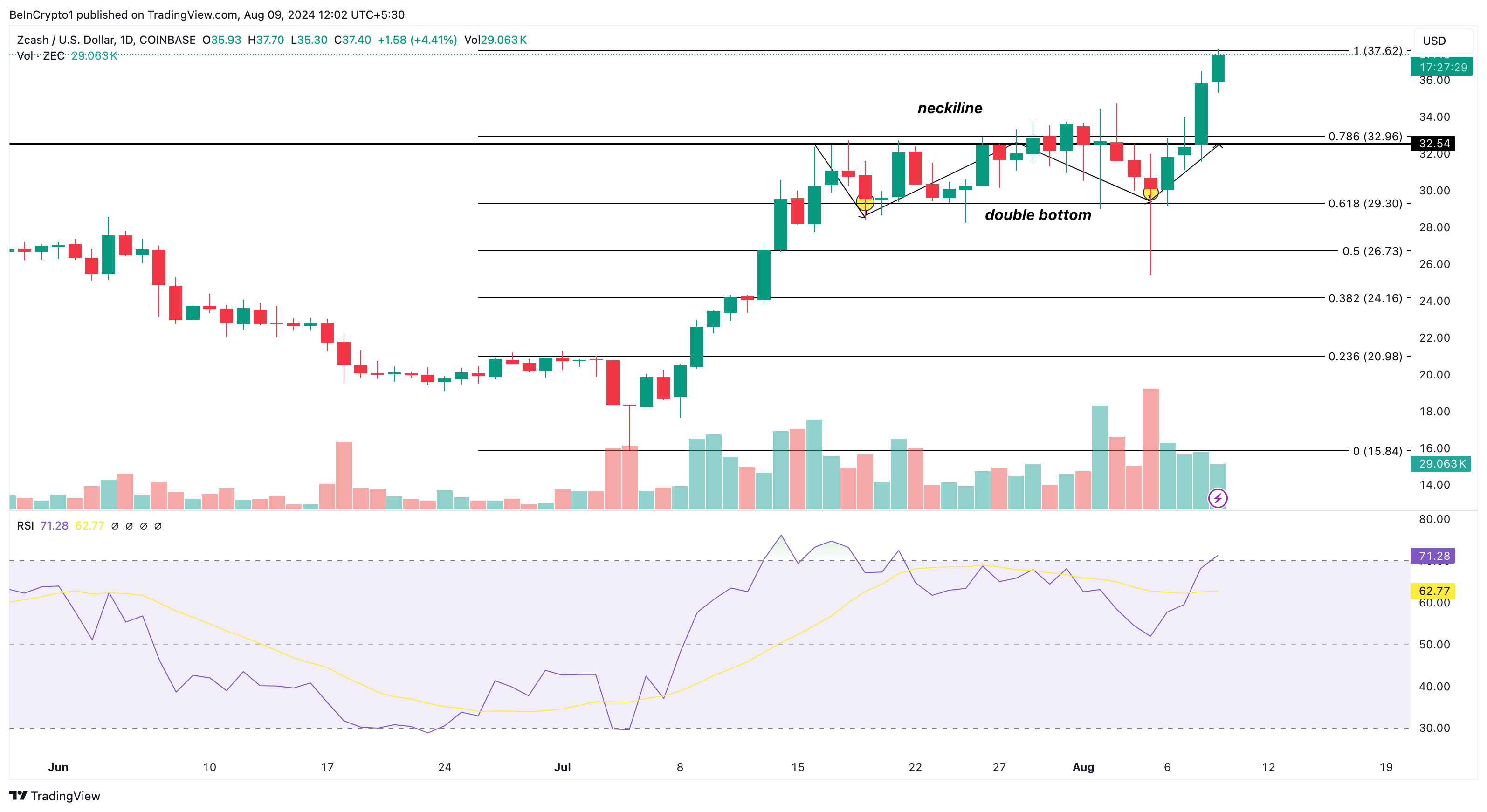 Kuten alla näkyy, ZEC vahvisti härkätrendin murtamalla kaulalinjan noin 32,54 dollarin kohdalla. Samaan aikaan Suhteellinen Voimaindeksi (RSI), joka mittaa momenttia, osoittaa, että token on yliostettu, lukemalla 71,28.