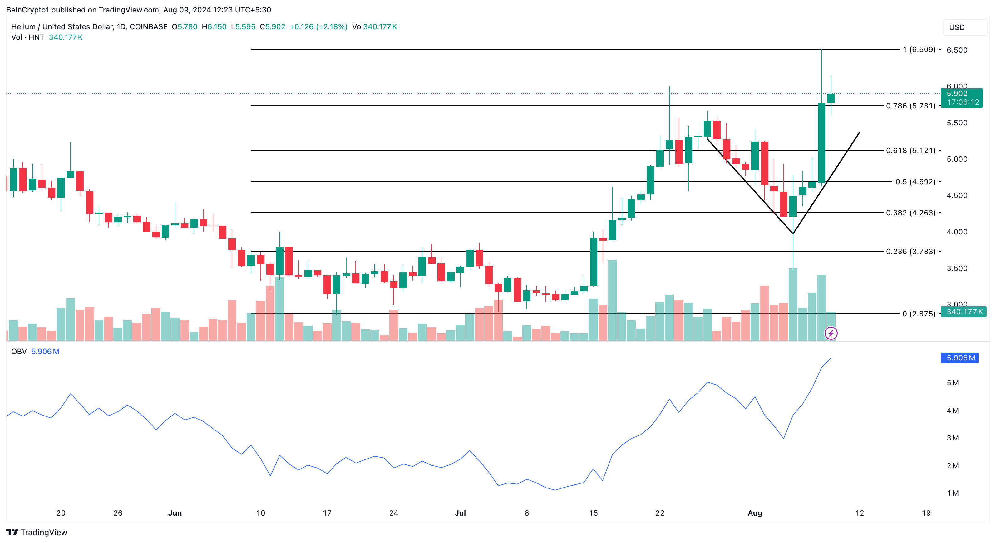 Heliumin nousu viime viikolla seurasi jyrkkää laskua, mutta token toipui nopeasti muodostaen V-kuvion, joka osoittaa vahvaa palautumista.