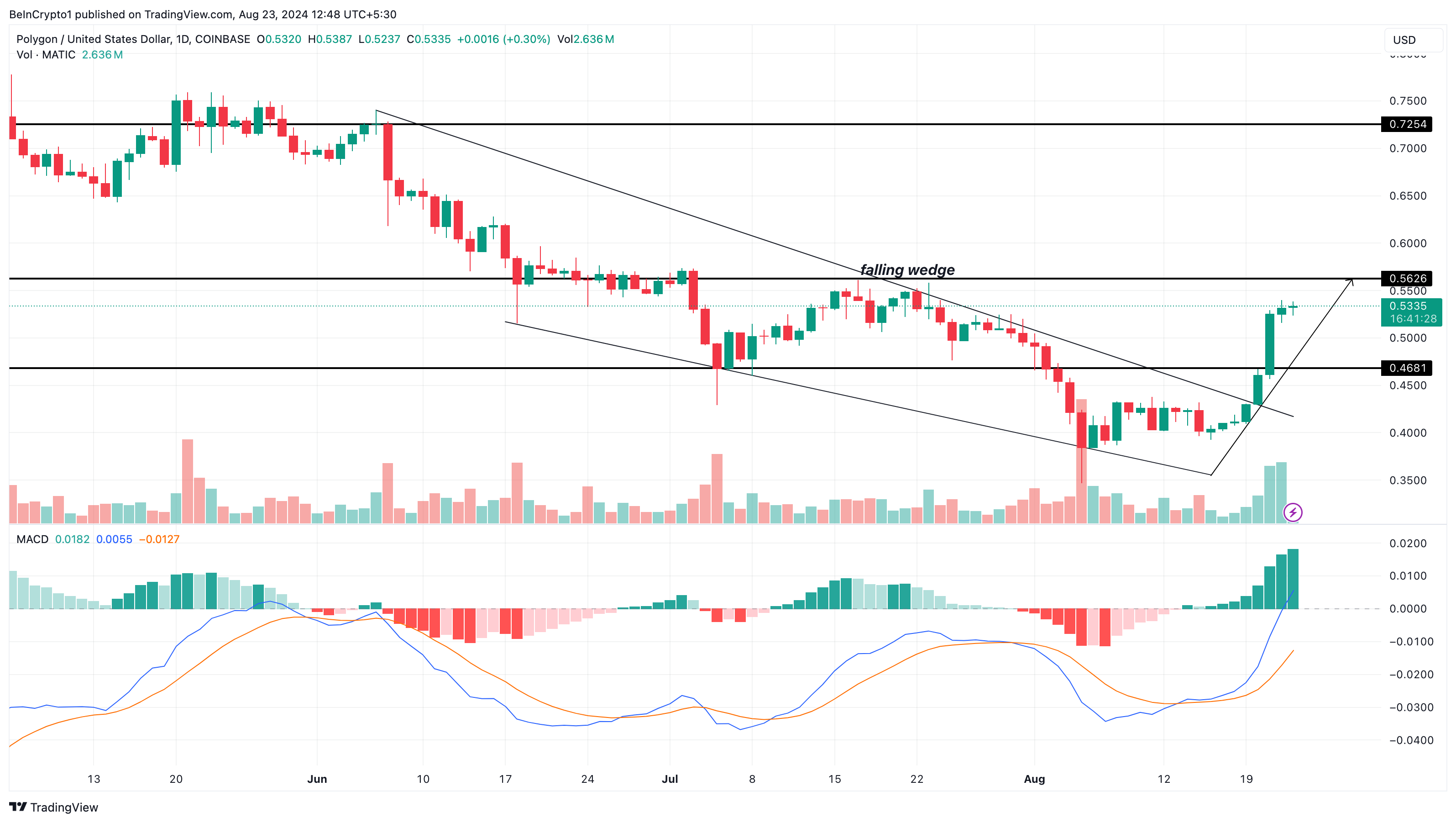 Teknisesti MATICin läpimurto johtui laskevasta kiilakuvioista. Laskeva kiila on härkämäinen kuvio, jossa kaksi alaspäin suuntautuvaa trendiviivaa — jotka edustavat alempia huippuja ja pohjia — yhtyvät. Ostajien astuessa sisään hidastamaan laskua tapahtuu käännös, kuten MATICin kohdalla nähtiin.