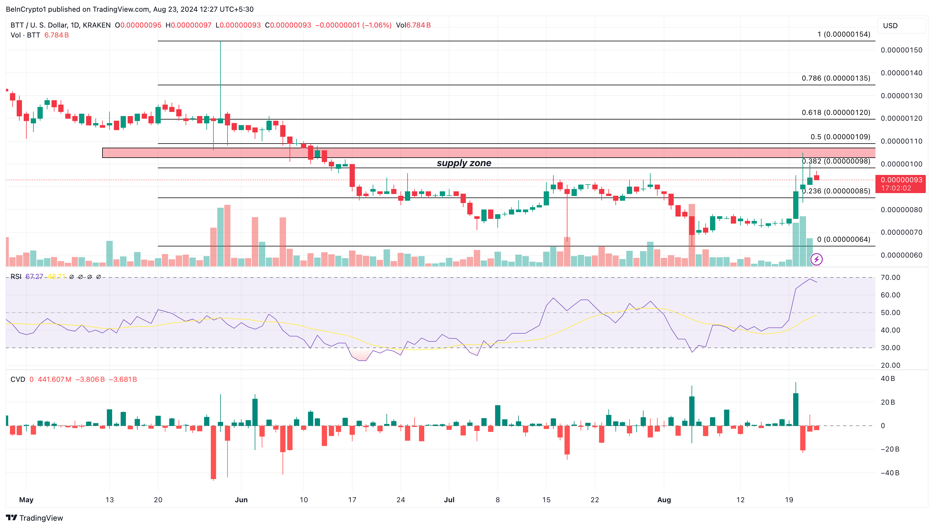 Tällä hetkellä BTT käy kauppaa 0,00000093 dollarin hintaan, mikä on korkein taso sitten 16. kesäkuuta. Kaksi päivää sitten se hetkellisesti saavutti 0,0000010 dollaria, tavoittaen historiallisesti merkittävän tarjonta-alueen, joka vaatii merkittävää ostovoimaa murtuakseen. Kuten päivittäisessä kaaviossa nähdään, härät eivät onnistuneet ylläpitämään momenttia tuolla tasolla, mikä johti hylkäämiseen.