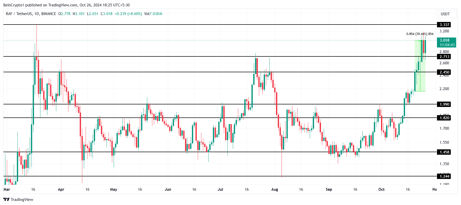 RAY koki lähes 40% kasvun viime viikolla, ja altcoinin nykyinen kaupankäyntihinta on 3,01 dollaria. Tämä vahva ylöspäin suuntautuva liike on asettanut RAY:n testaamaan 3,33 dollarin vastustasoa, joka on kriittinen taso jatkuvan kasvun kannalta.