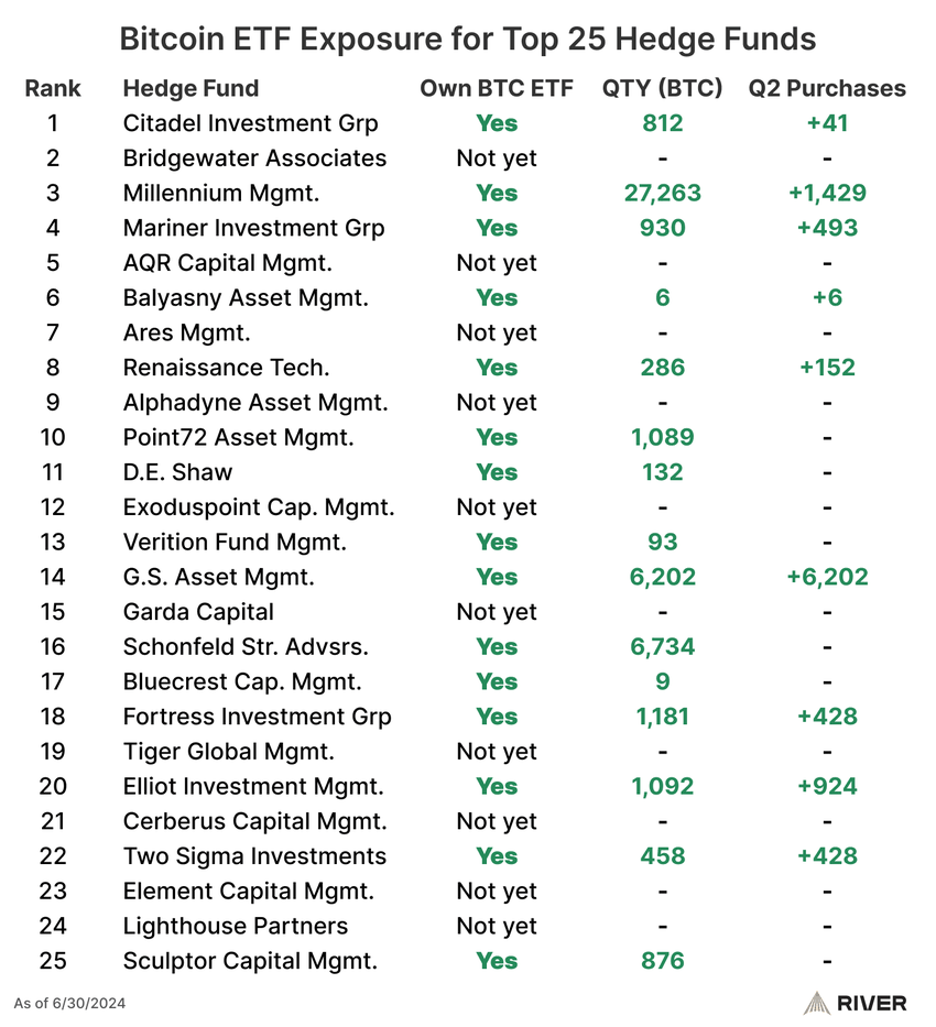 Citadel Investments, Millennium Management, Mariner Investment ja Fortress Investment ovat muun muassa lisänneet osuuksiaan toisella neljänneksellä. Lisäksi 13 Yhdysvaltain 25 suurimmasta rekisteröidystä sijoitusneuvojasta (RIAs) omistaa nyt Bitcoinia ETF:ien kautta.
