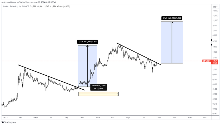 “STX on menossa lähetettäväksi. BTC L2-narratiivi + Nakamoto-päivitys ensi viikolla. Viimeksi kun STX mursi diagonaalisen vastuksen, se rallasi +600% viidessä kuukaudessa,” kryptovaluuttakauppias AlejandroBTC kommentoi.