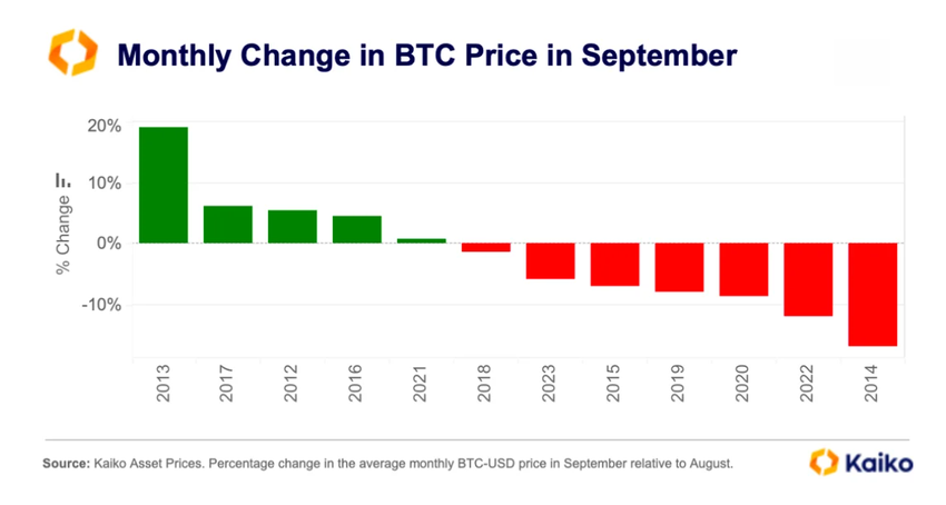 Kaikon kryptoanalyysifirman analyytikot viittaavat Bitcoinin (BTC) “syyskuun vaikutukseen”, ilmiöön, jossa kryptovaluutta on laskenut seitsemänä viimeisestä kahdestatoista syyskuusta. Tämä suuntaus on jatkunut vuonna 2024, kun Bitcoin laski 7,5% elokuussa ja toiset 6,3% tähän mennessä syyskuussa.