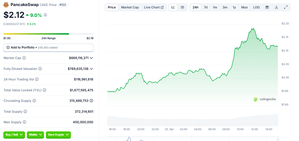 CoinGeckon tiedot osoittavat, että Pancaken CAKE:n hinta oli 2,12 dollaria tätä kirjoitettaessa, nousua lähes 10 % viimeisen 24 tunnin aikana.