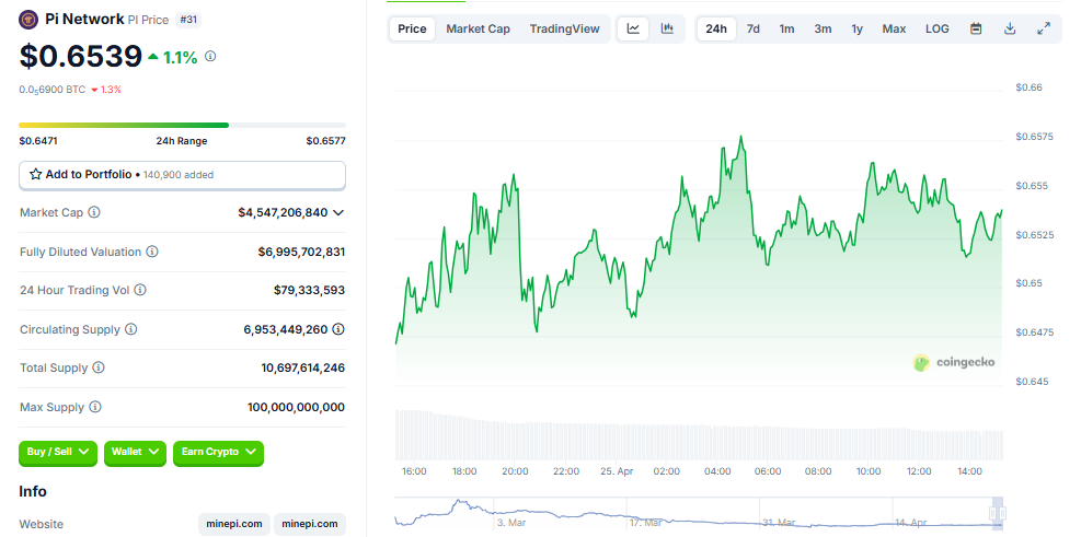 Coingeckon tiedot osoittavat, että PI-kolikko oli kaupankäynnissä 0,6539 dollaria tätä kirjoitettaessa, nousua vaatimattomat 1,1 % viimeisen 24 tunnin aikana.