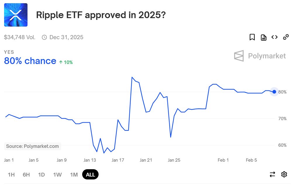 Ennustusalustalla Polymarket, XRP ETF:n hyväksynnän todennäköisyys vuonna 2025 on ollut huomattavan korkea. Todennäköisyys oli merkittävä 80% tämän raportin aikaan.