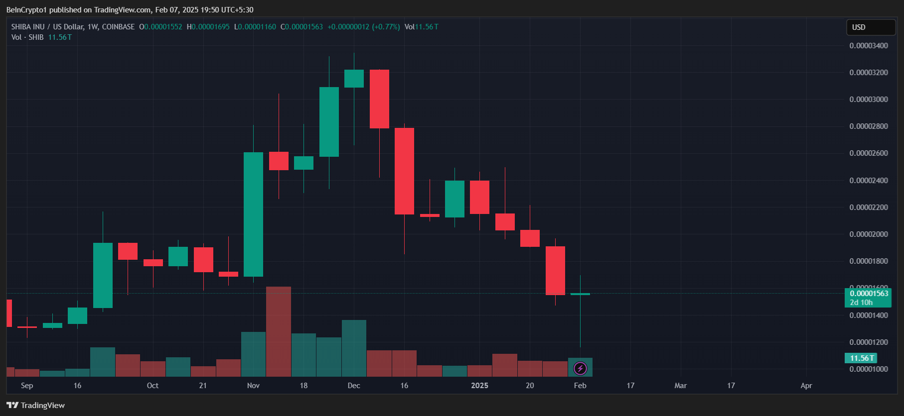 Shiba Inun hinta nousi hetkellisesti ilmoituksen jälkeen. Kirjoitushetkellä meemikolikko kävi kauppaa hintaan 0,00001563 dollaria.