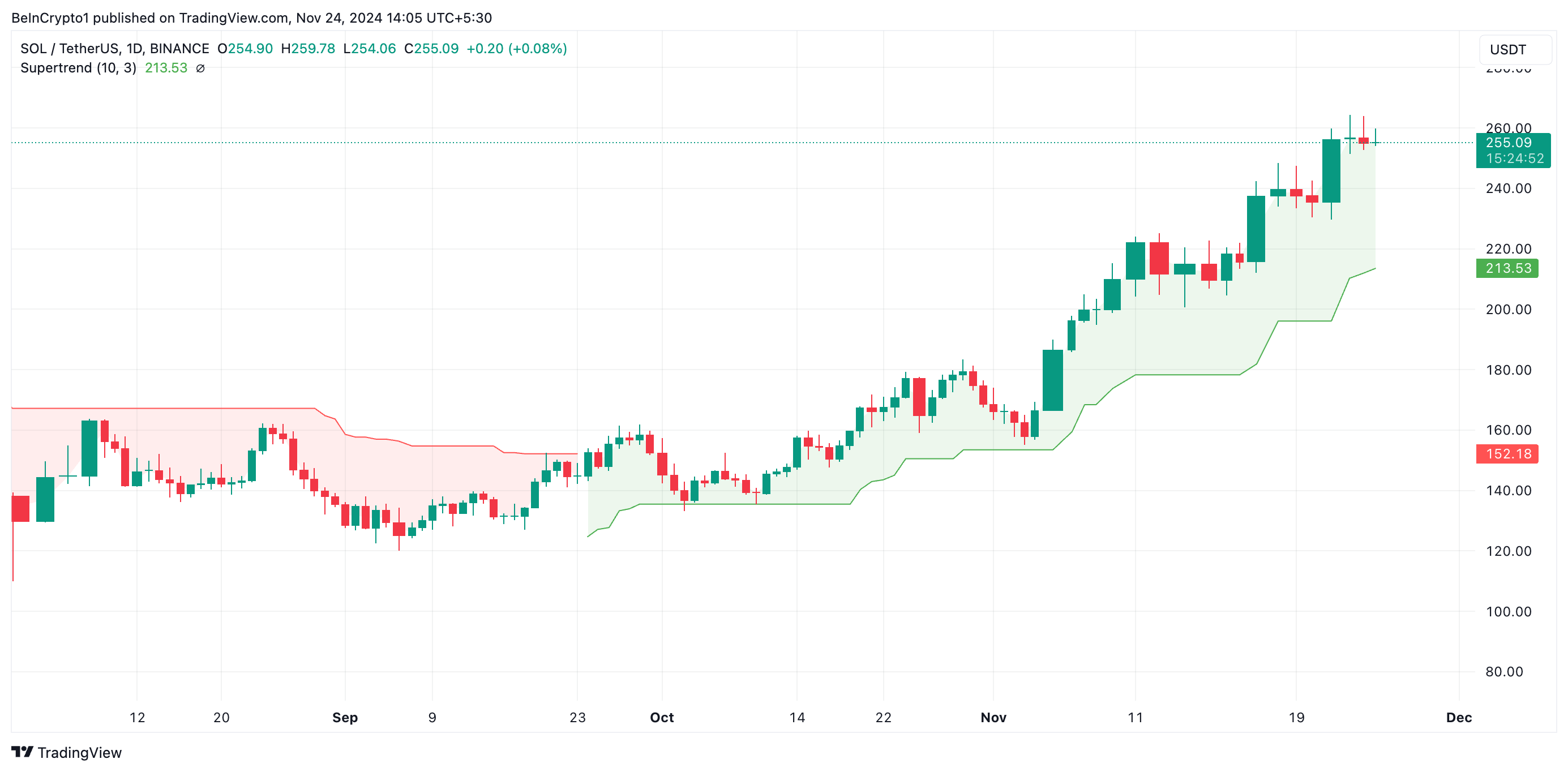 Solanan (SOL) hinta saavutti uuden kaikkien aikojen ennätyksen 264,39 dollaria kaupankäyntisession aikana 23. marraskuuta. Sen hinta on sittemmin kokenut 3 % korjauksen, mikä on aiheuttanut suositun altcoinin vaihtavan omistajaa hintaan 255,12 dollaria tätä kirjoitettaessa.