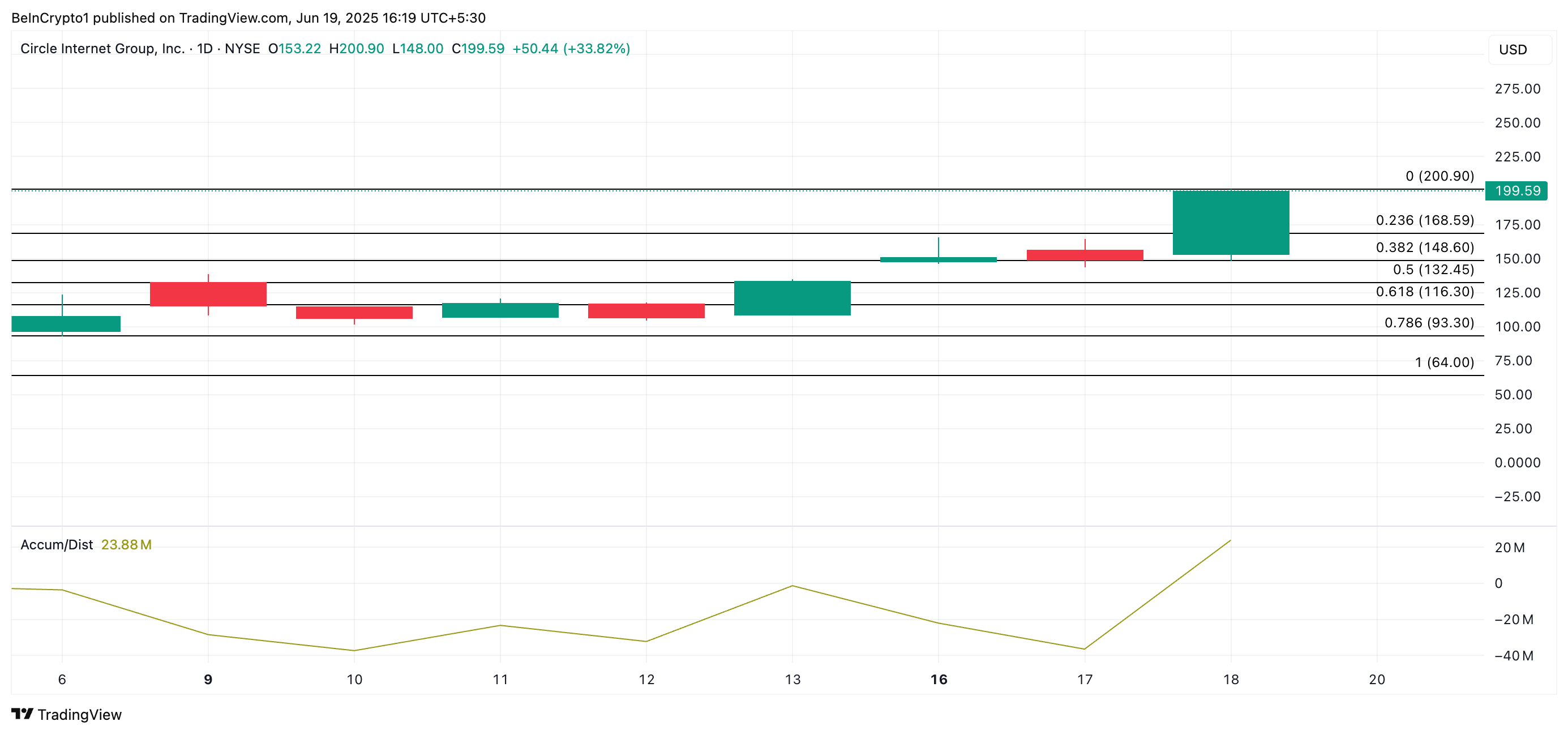Jos tämä suuntaus jatkuu, CRCL voisi ylittää kaikkien aikojen korkeimman 200,90 dollarin tasonsa, jatkaen nousuaan.