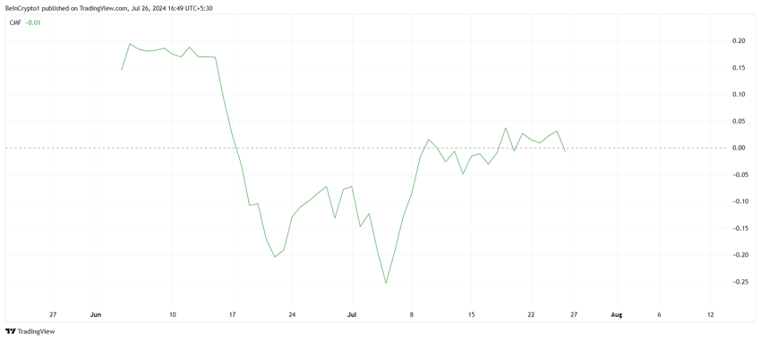 Kuitenkin CMF (Chaikin Money Flow) kertoo toisen tarinan. Tämä tekninen indikaattori, joka mittaa rahan virtausta omaisuusvaraan sisään ja ulos, osoittaa, että altcoin kamppailee merkittävien sijoitusten houkuttelemisessa.
