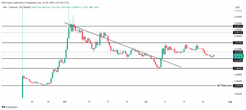 Telegram Coin Notcoin (NOT) -hinta näyttää merkkejä mahdollisesta toipumisesta huomattavan laskun jälkeen viime päivinä.