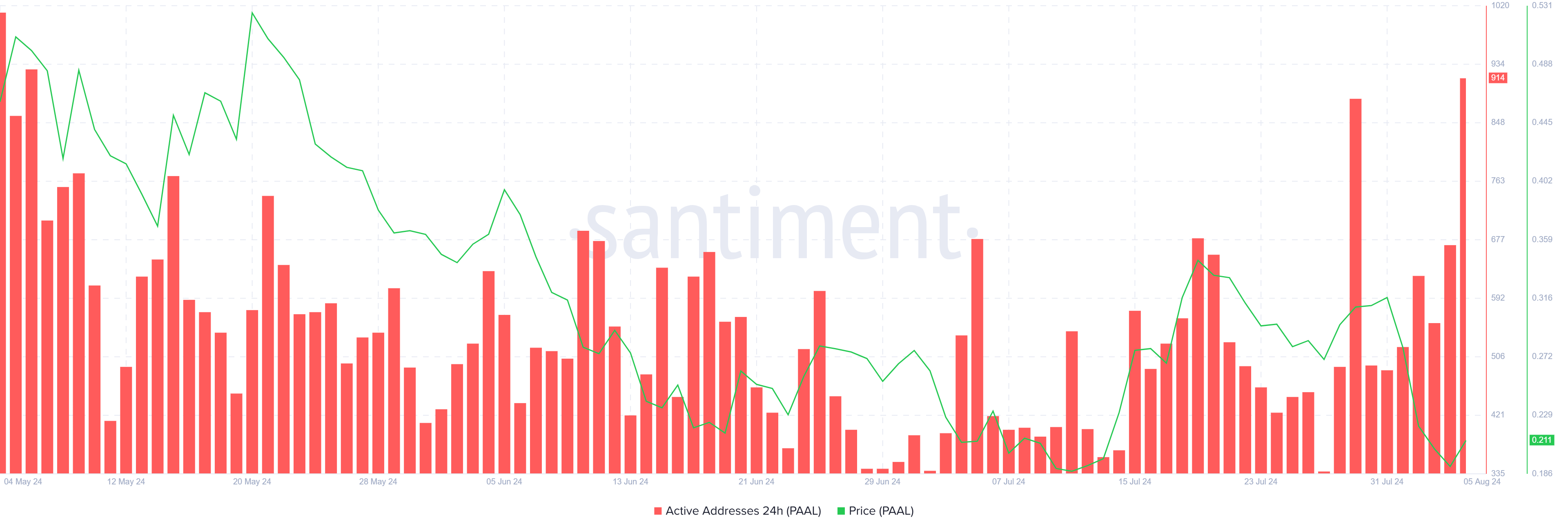PAAL:n hinta on noussut huomattavasti 28% viimeisen 24 tunnin aikana, mikä on houkutellut monia sijoittajia palaamaan ja osallistumaan verkkoon. Tämän seurauksena aktiivisten osoitteiden määrä kasvoi 36%, saavuttaen kolmen kuukauden korkeimman tason.