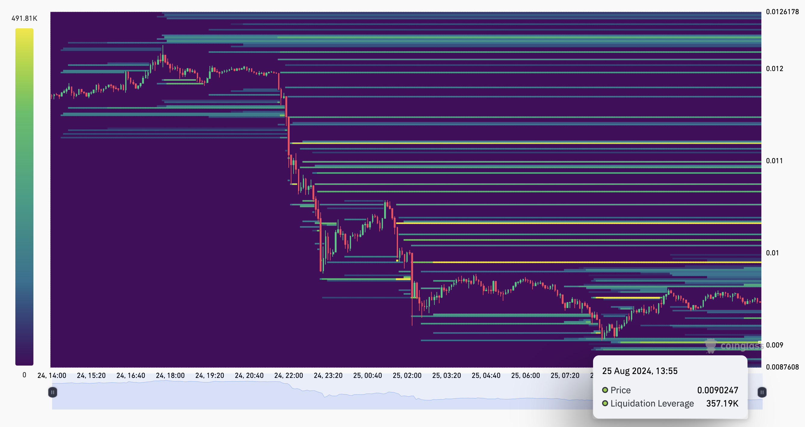Samalla indikaattorilla, mitä suurempi likviditeetin keskittyminen pisteessä on, sitä suurempi on mahdollisuus, että hinta liikkuu kyseiselle alueelle. Tätä kirjoitettaessa Notcoinilla on korkea likviditeetin keskittyminen 0,0090 dollarin kohdalla.